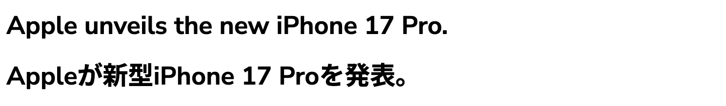 When styled this way, the English and Japanese text sit naturally on the same line — adjusting the English spans with a slightly larger font size and a small vertical-align nudge raises their baseline just enough to match the Japanese characters. The result feels balanced in both weight and rhythm — one cohesive headline, not two scripts stitched together.